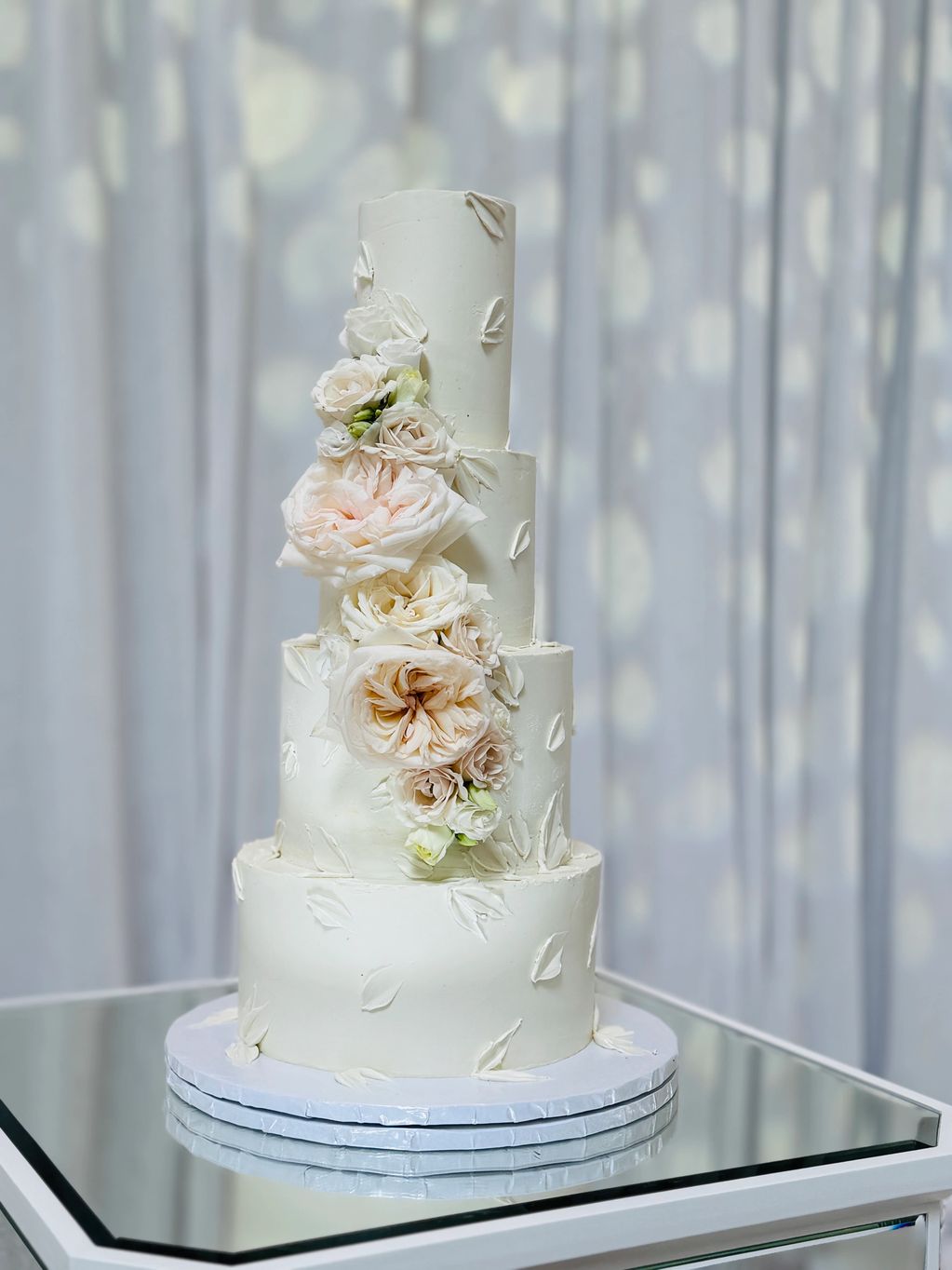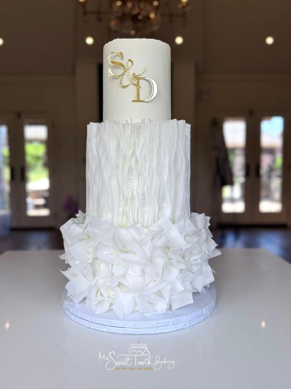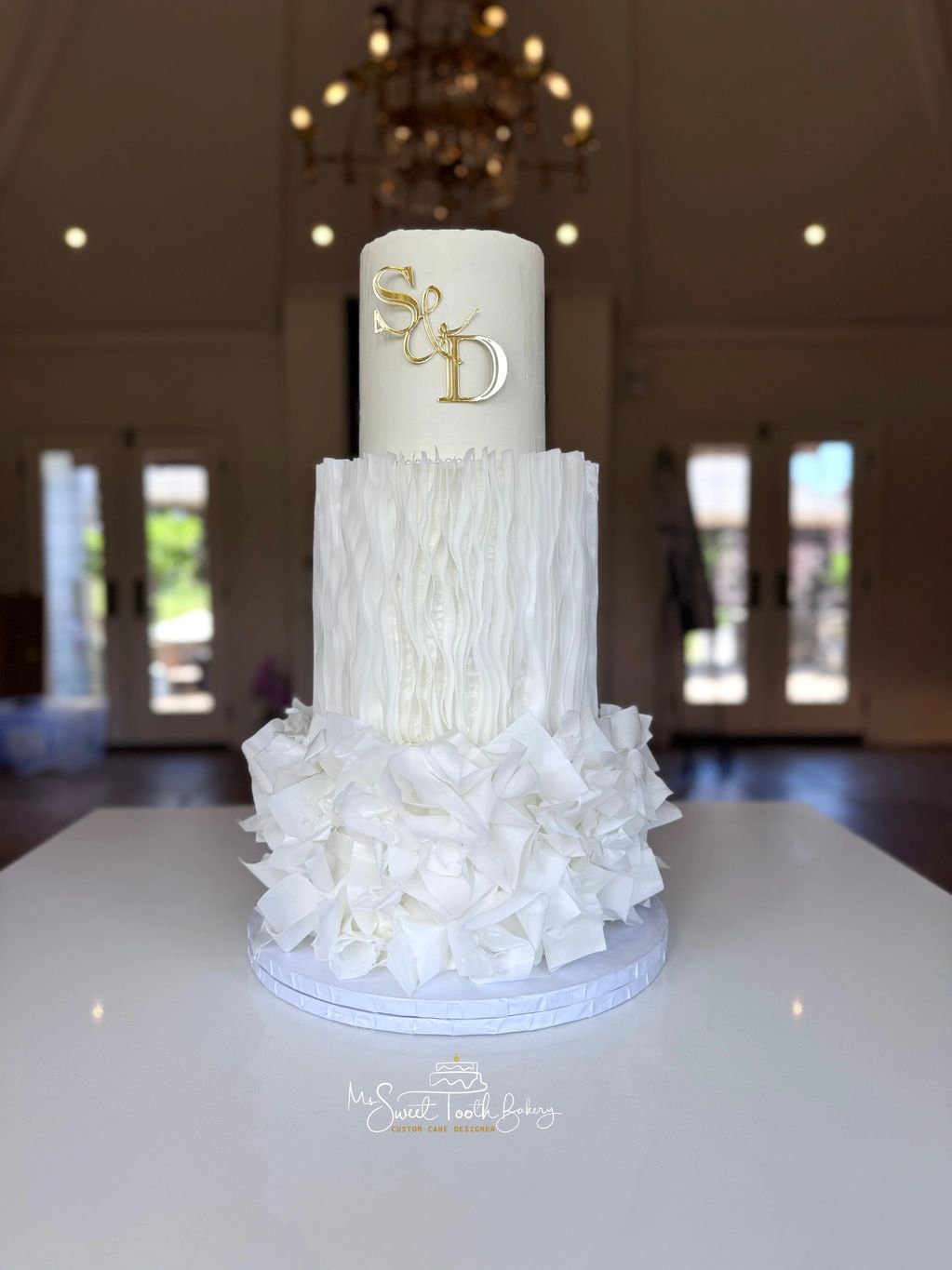 An all-white modern design, featuring delicately placed wafer paper ruffles and vertical strips for a look that’s both sleek and elegantly refined.