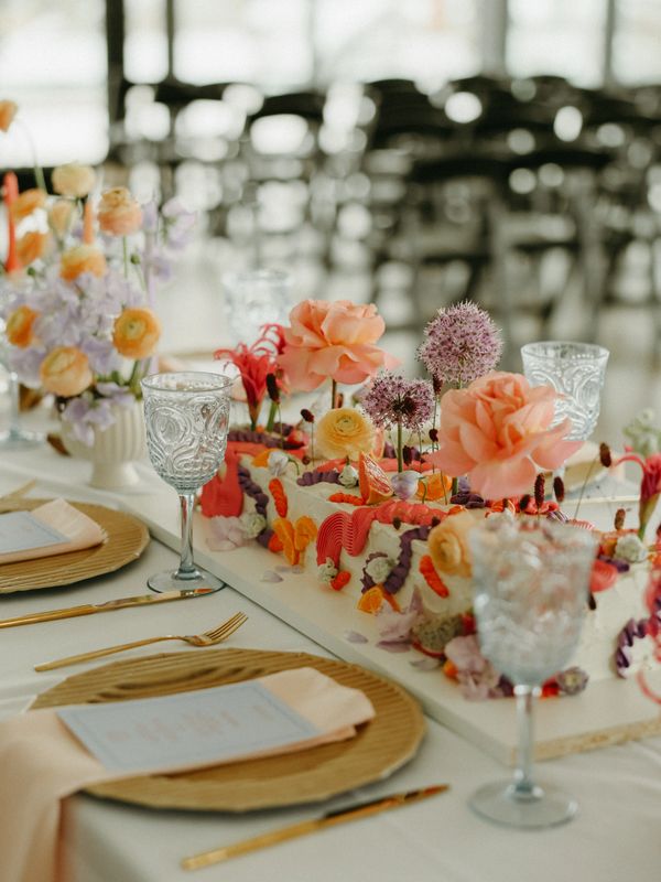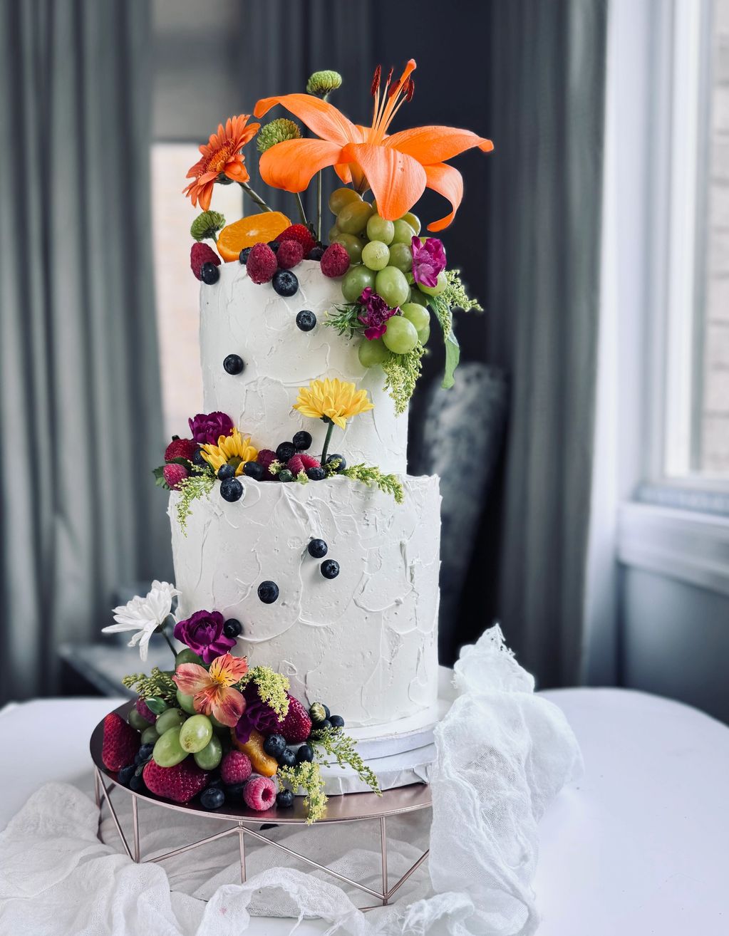 A modern take on the classic tiered cake, styled with seasonal fruits and florals for a fresh, artful twist.