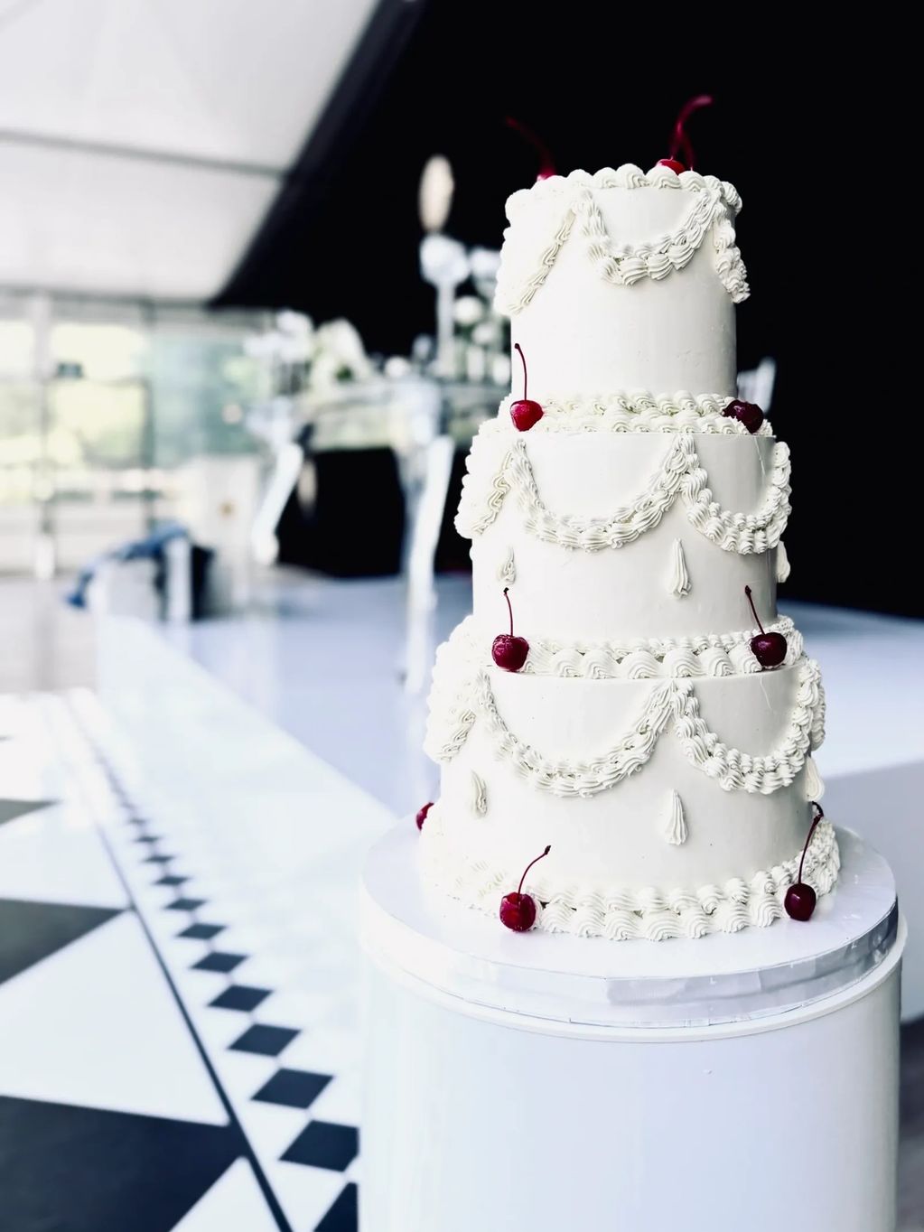 An all-white vintage tiered cake, accented with red-stemmed cherries for a delicate, eye-catching contrast.
